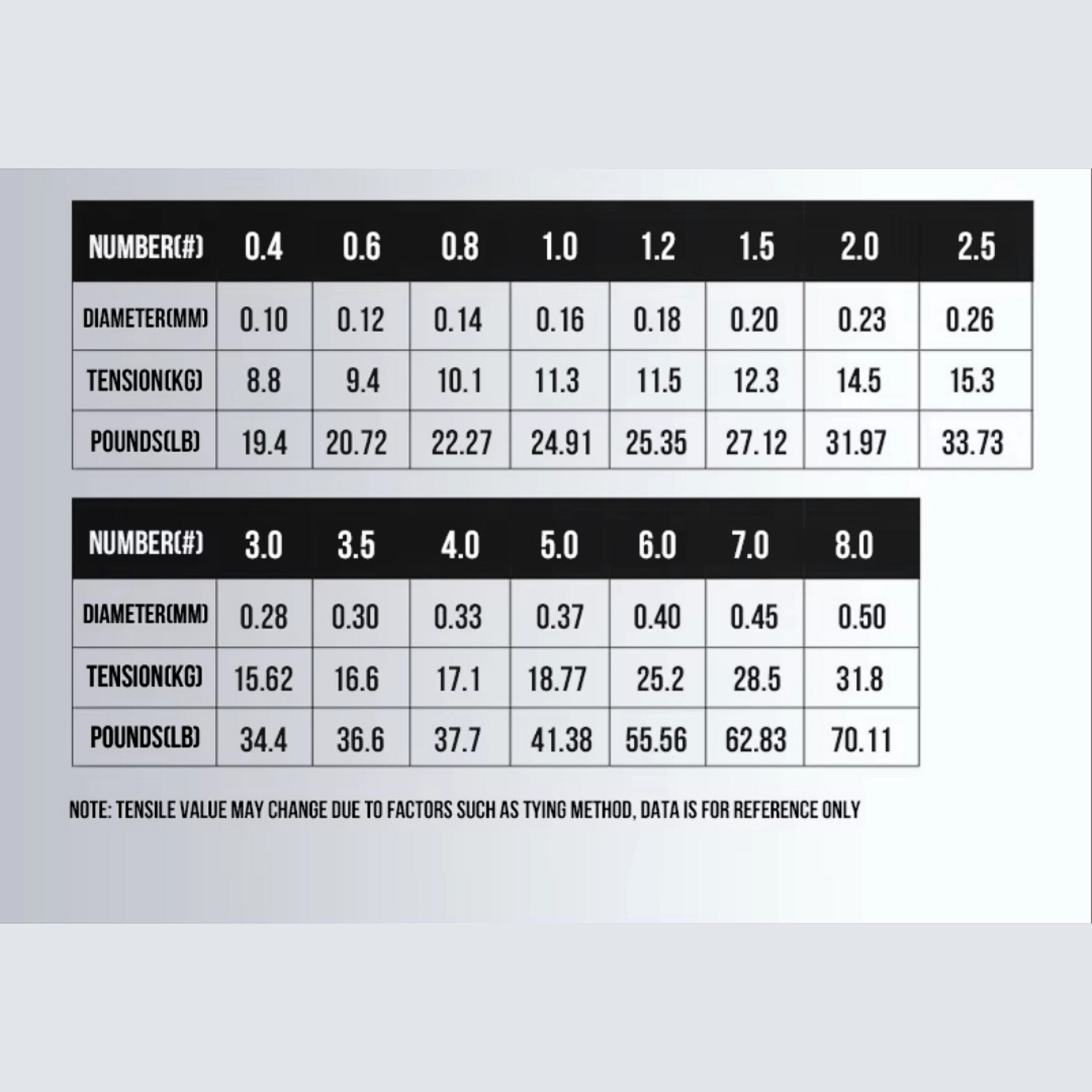 3.5 – 0.30MM – 16.6KG ,6.0 – 0.40MM – 25.2KG ,7.0 – 0.45MM – 28.5KG ,8.0 – 0.50MM – 31.8KG |